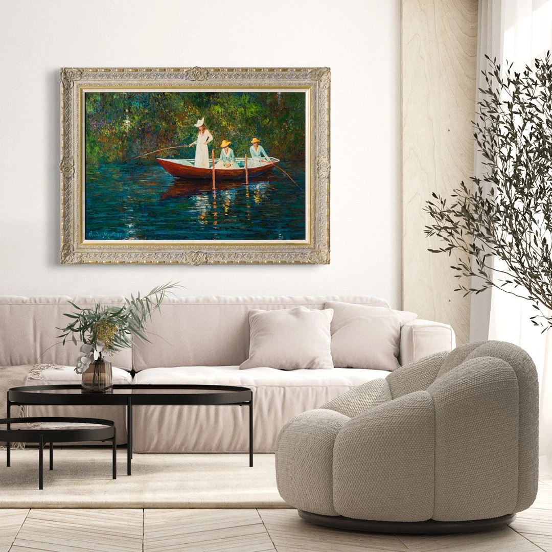 Between 1887-1888, Monet returned to one of his earlier subjects undertaken at Argenteuil, having painted at least six large canvases depicting Alice’s daughter’s boating. Monet represents the figures as individuals rather than shadowy, light-bathed silhouettes, and they take on the fullness of a living entity. Symbolist in its dreamy, ethereal atmosphere, “La Bargue 1887” gives the impression of an enclosed and private world created through soft hues.