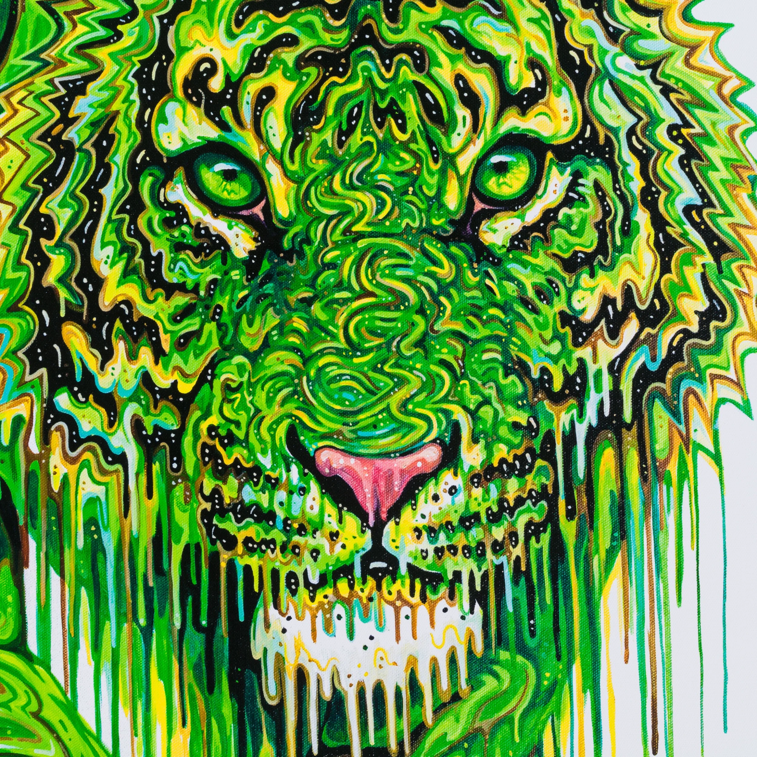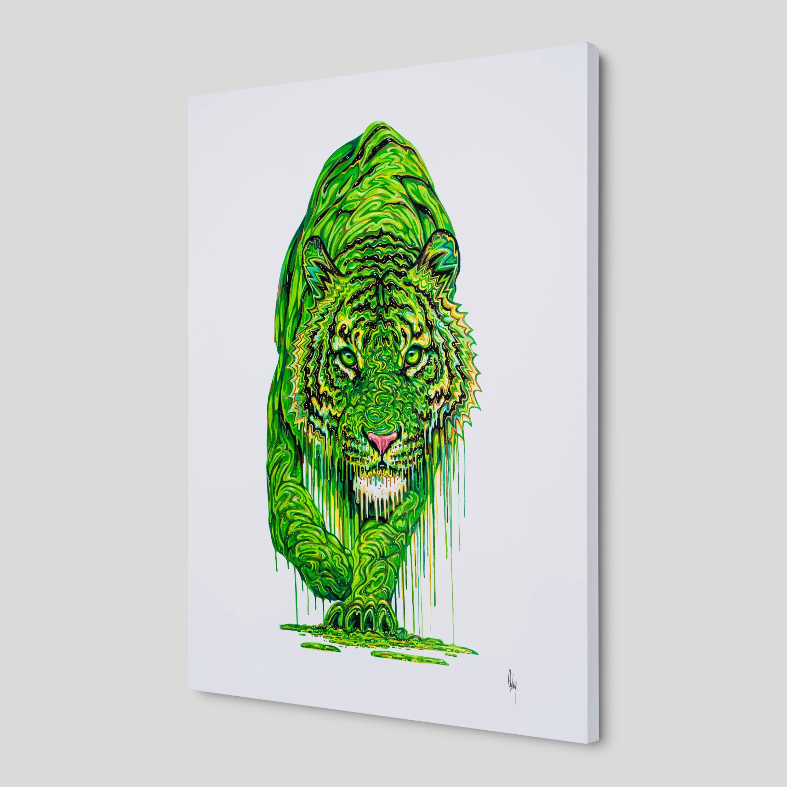 Named after the herb basil leaves commonly associated with freshness and nature, in this boutique edition “Basil” the traditional colours of a tiger are overthrown by exciting shades green, transforming the animal into an “ethereal, astral” being through his kaleidoscopic use of colour and form. Many of Oxley’s pieces skilfully blend elements of surrealism and expressionism, infusing each piece with energy and emotion. His expressive brushwork is energetic and fluid, giving his paintings a sense of movement and spontaneity as his captivating portraits feature wild animals created through intense patterns and psychedelic colour.
