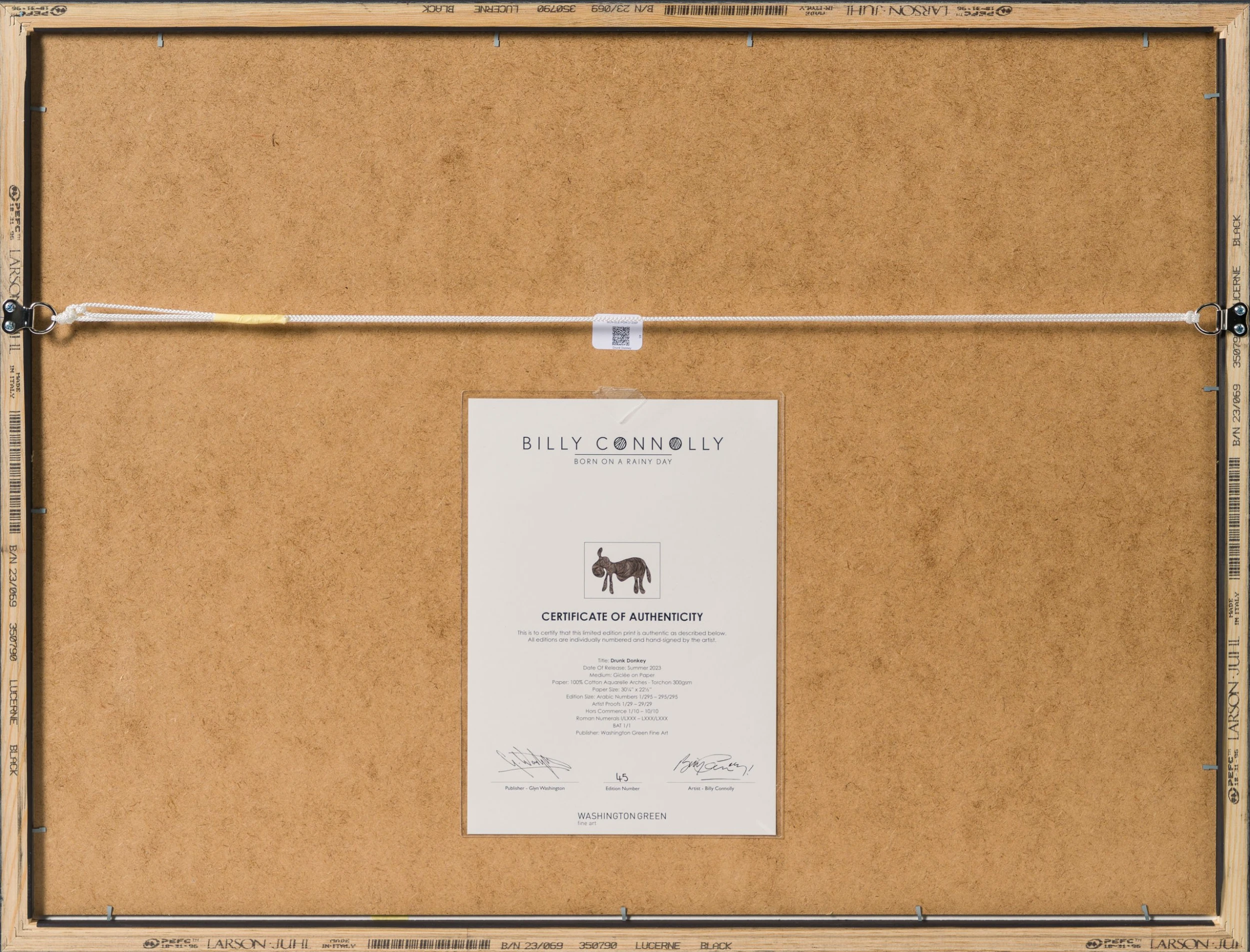 Given the artwork is a Double Hit Flatbed Giclée Print, the texture and glossiness of the line’s contrast beautifully with the deckle-edged 100% Cotton Aquarelle Arches-Torchon 300gsm paper. Hand-signed by The Big Yin himself, this artwork will add a bold and humorous touch of musical and comedic history to your home.