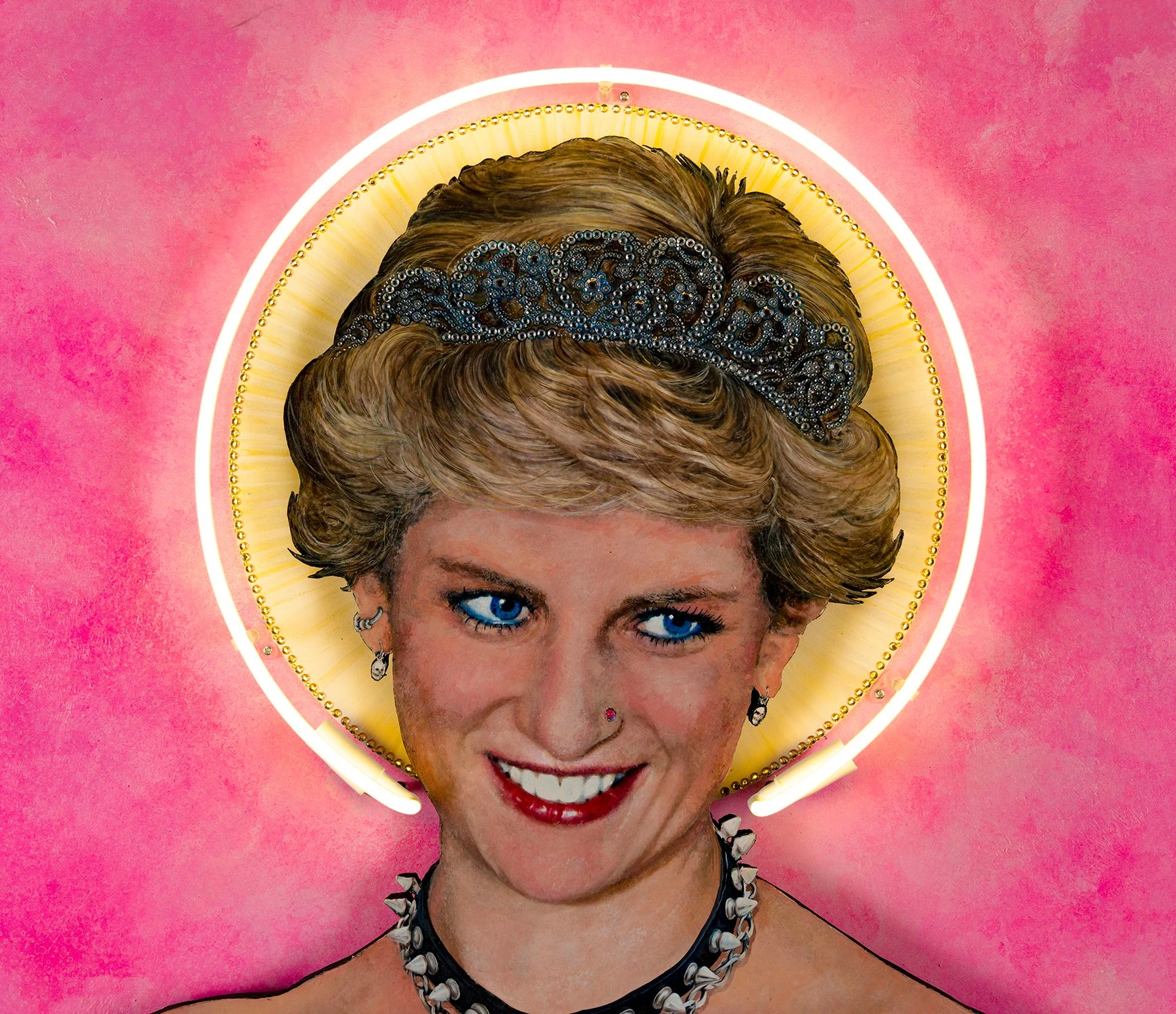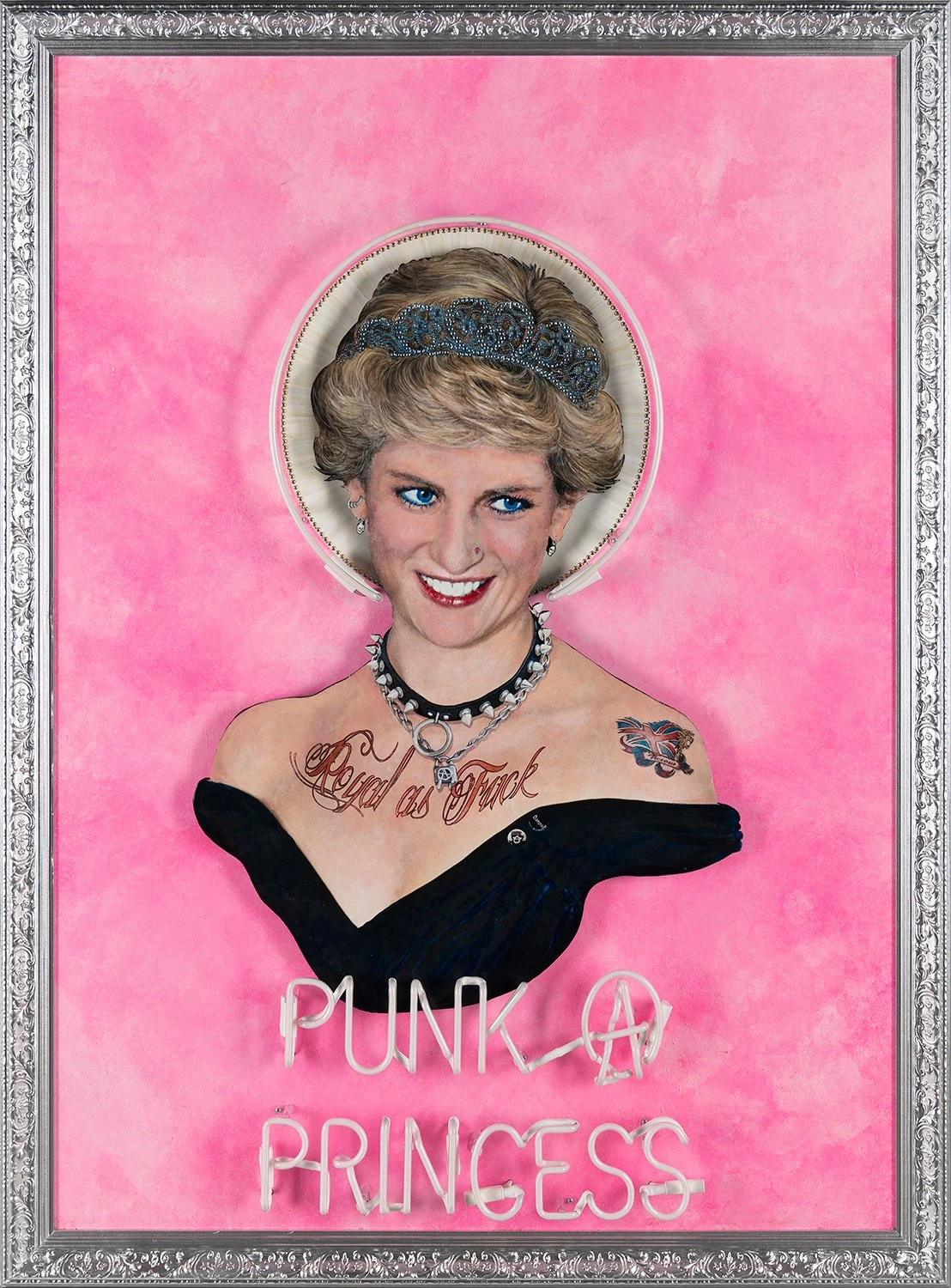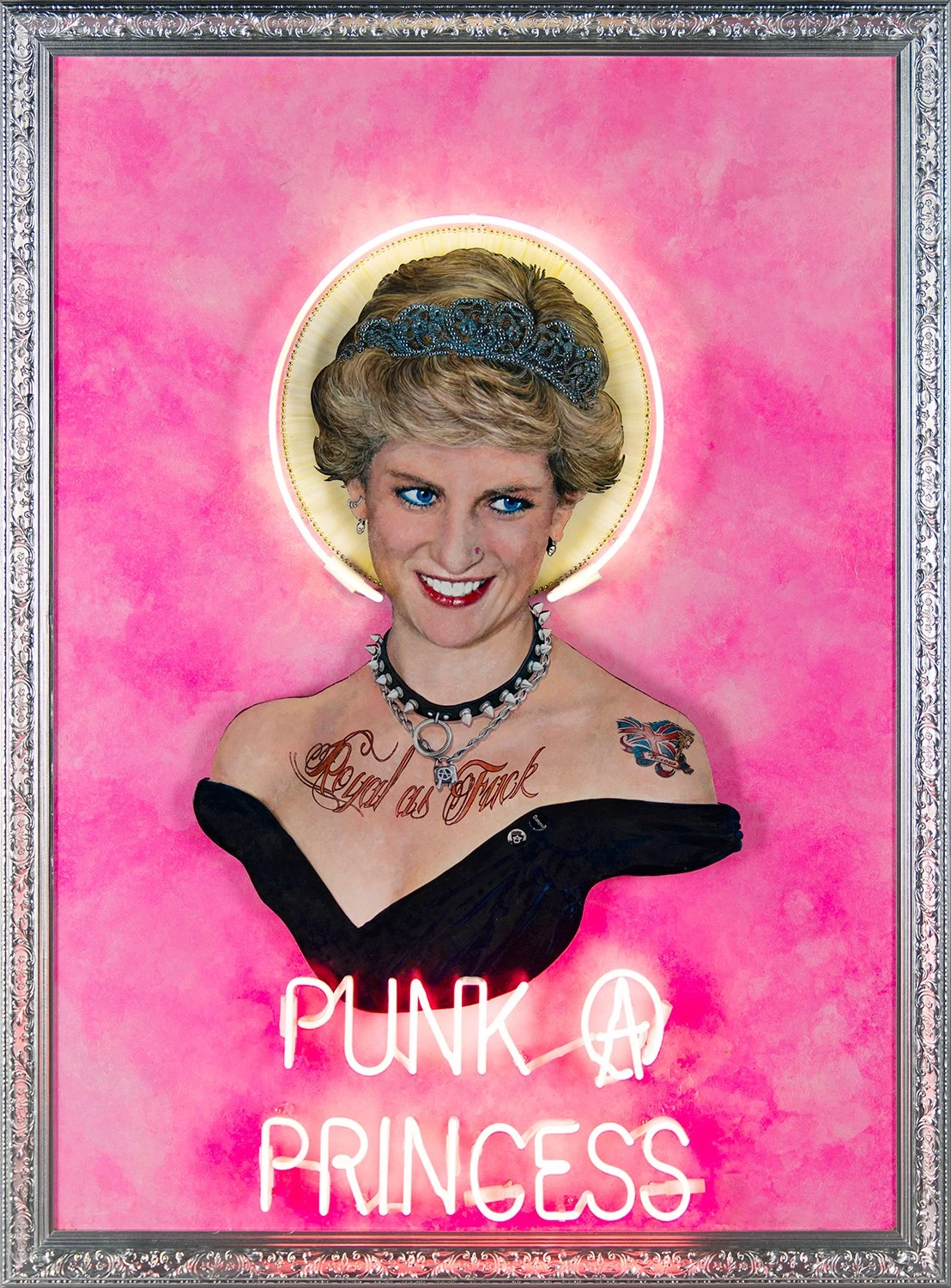 This electrifying original artwork by Mark Sloper represents all that ‘Illuminati Neon’ is. Bold, bright and bonkers, the punk artist combines his many years working in the film and music industry with his expertise in the field of neon gas. On creating this piece, Mark said “Let’s celebrate [Princess Diana] as a rebel, as a punk… The tattoo on her shoulder says ‘Vicious’- that’s me imagining Sid Vicious as her beau.”